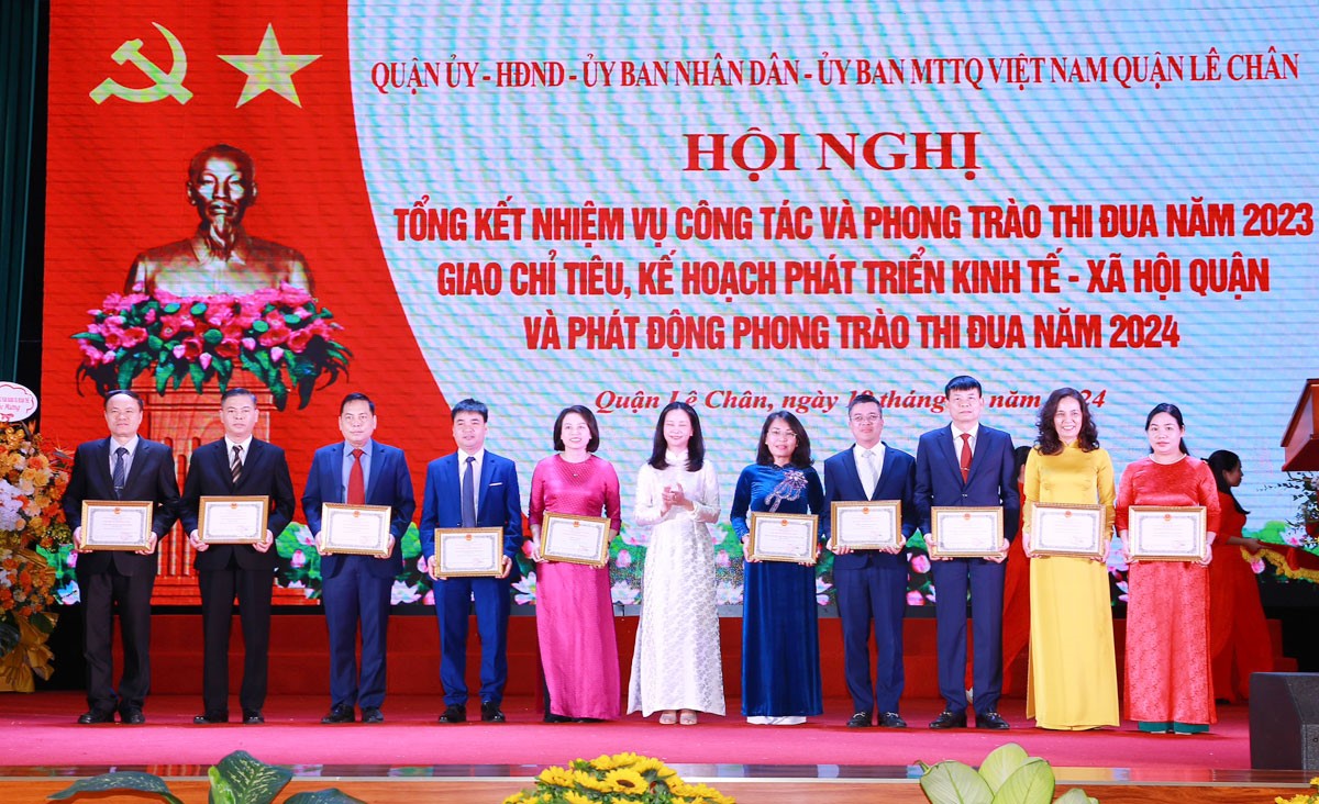 Năm 2023, quận Lê Chân hoàn thành và hoàn thành vượt mức kế hoạch, nhiệm vụ thành phố và HĐND quận giao. Chủ đề năm của thành phố và Chủ đề năm của quận được tập trung chỉ đạo, triển khai đạt một số kết quả tích cực. Công tác thu ngân sách được tập trung ngay từ những tháng đầu năm, kết quả thu sắc thuế đạt nhiều khả quan như: Tổng thu ngân sách đạt 1.060,352 tỷ, vượt kế hoạch thành phố giao 15,3%, tăng 17% so với cùng kỳ, trong đó thu ngoài quốc doanh (vượt 19,5%), tiền sử dụng đất (vượt 62,4%); thuế sử dụng đất phi nông nghiệp (vượt 19%), phí, lệ phí (vượt 29%) so với năm 2022; chủ động thực hiện tự chủ thu chi ngân sách. Nhân dịp này, 01 tập thể được nhận Bằng khen của Thủ tướng Chính phủ. UBND thành phố tặng Cờ thi đua cho 04 tập thể; tặng Danh hiệu “Tập thể lao động xuất sắc” cho10 tập thể; tặng Bằng khen của UBND thành phố cho 13 tập thể và 13 cá nhân. UBND quận biểu dương, khen thưởng 52 tập thể, 85 cá nhân có thành tích hoàn thành xuất sắc nhiệm vụ năm 2023.